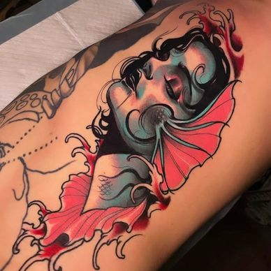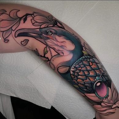 Neo-traditional tattoos carry the bold outlines and rich colours of traditional tattooing, but with more depth, shading, and flexibility in design. The style allows for both classic motifs and more personal, unique imagery.